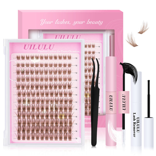 Uilulu Brown Lash Clusters Kit 10-18mm Wispy Lash Clusters D Curl Eyelash Clusters, DIY Lash Extension Kit with Lash Bond & Seal, Lash Glue Remover, Lash Tweezers(U19 Lash Kit)