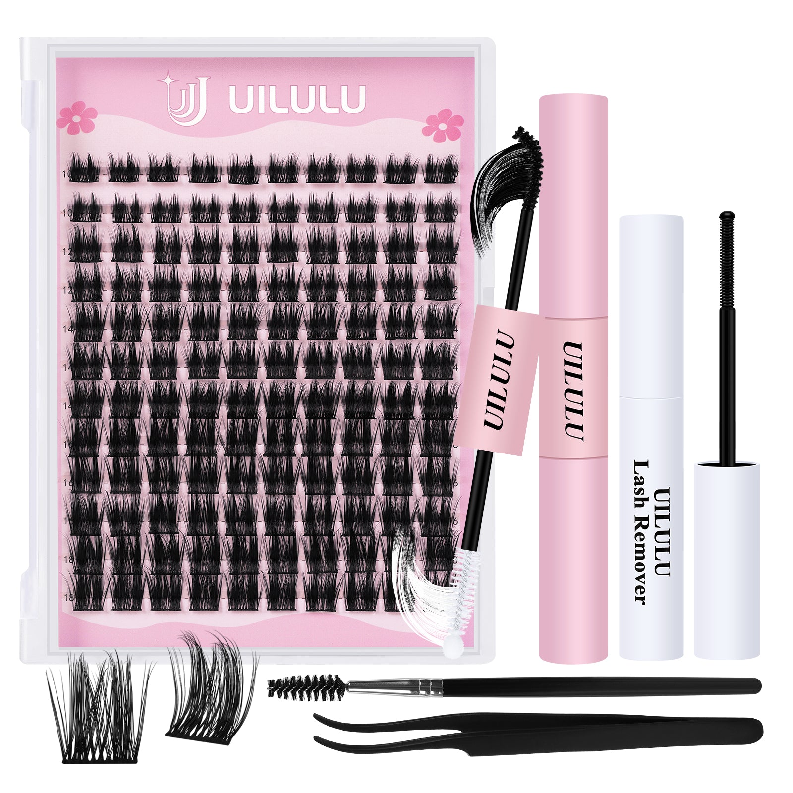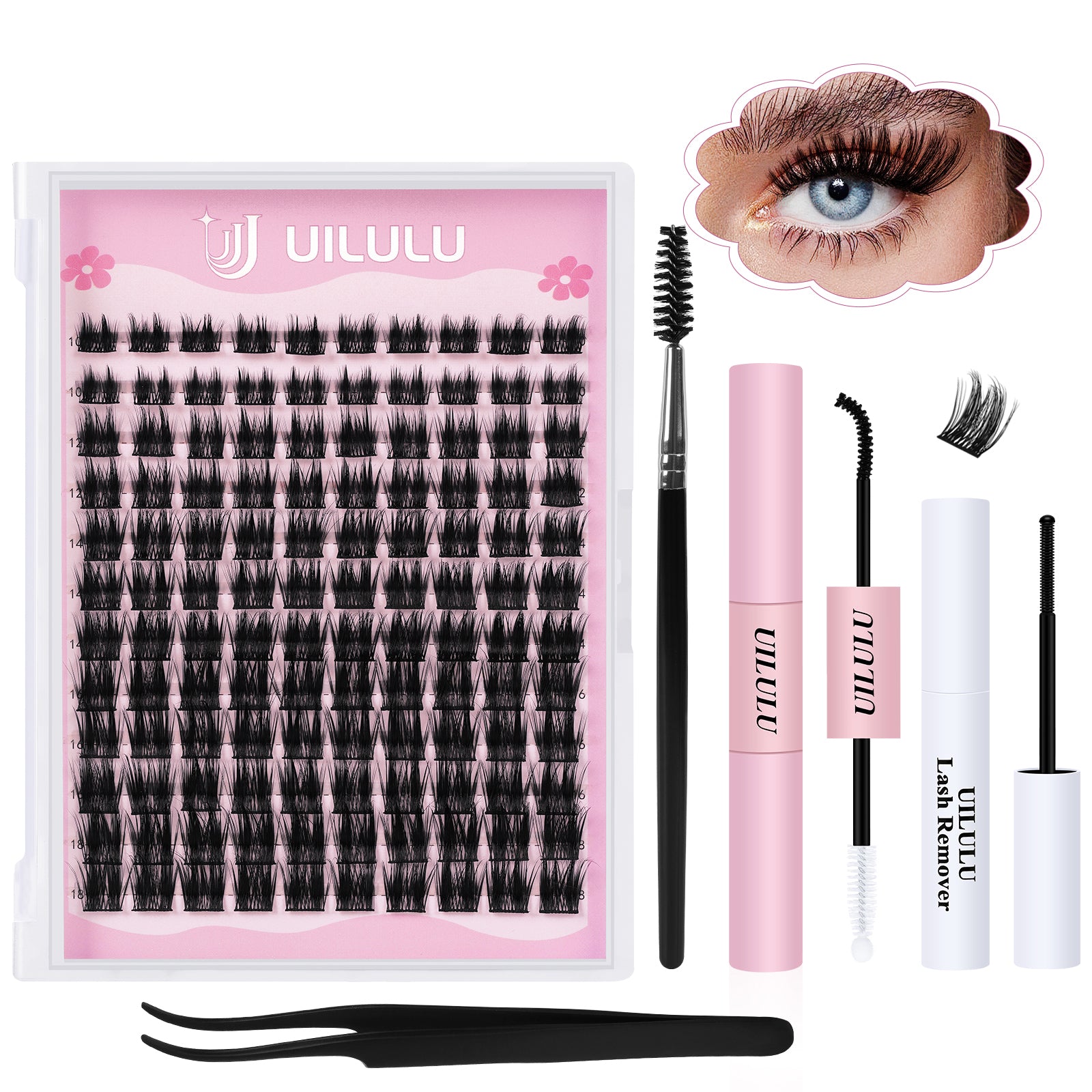 Uilulu Lash Clusters Kit 10-18mm Natural Lashes Clusters D Curl False Eyelash Clusters, DIY Lash Extension Kit with Lash Bond & Seal, Lash Glue Remover, Lash Tweezers & Lash Brush(U05 Lash Kit)