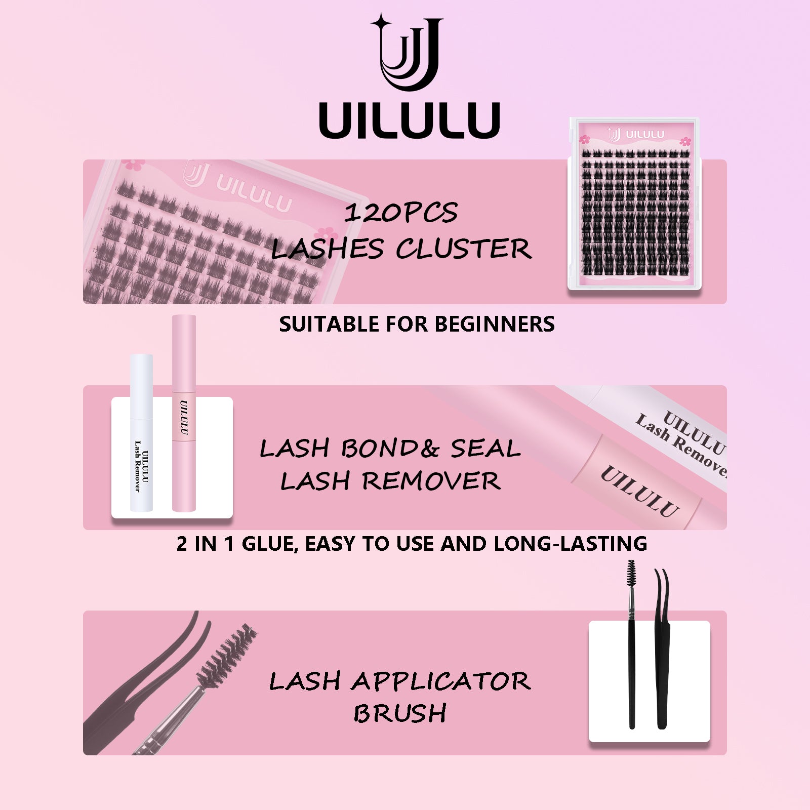 Valued-pack Lash Clusters Kit: Package comes with one box of 120 count false eyelashes clusters(10-18mm), lash bond & seal X 1, lash glue remover X 1, lash tweezers X 1, lash brush X 1. Full set of lashes clusters kit, providing you great at home lashes DIY experiences