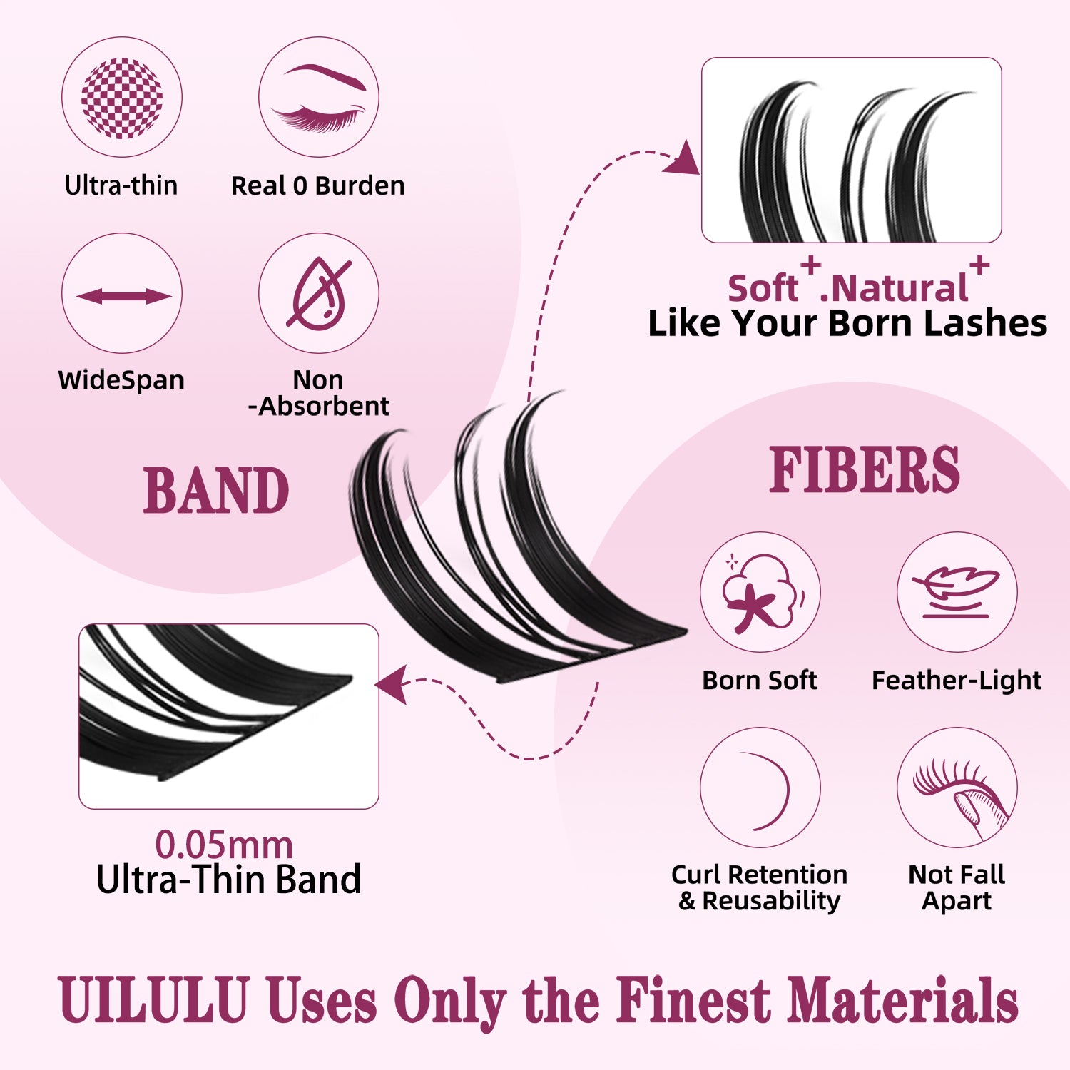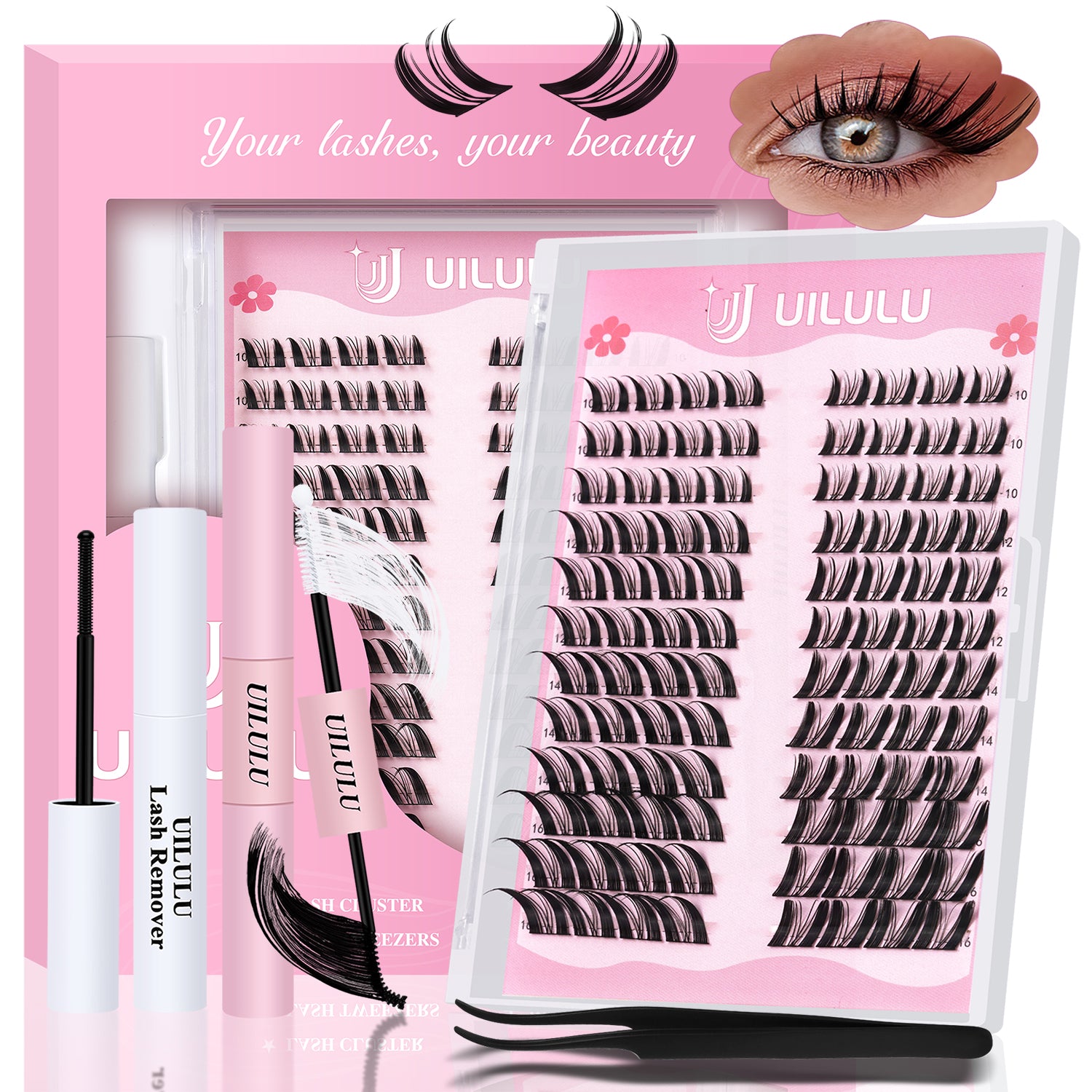- UILULU Manga Fairy Lash Clusters Kit: The package comes with one box of 96-count false eyelash clusters(D Curl, left-right cluster), lash bond & seal X 1, lash glue remover X 1, lash tweezers X 1. Our lash clusters are made with the finest updated PBT materials to ensure softness, thickness, durability, and longevity, designed to give you fuller lashes that look more natural than traditional false eyelashes