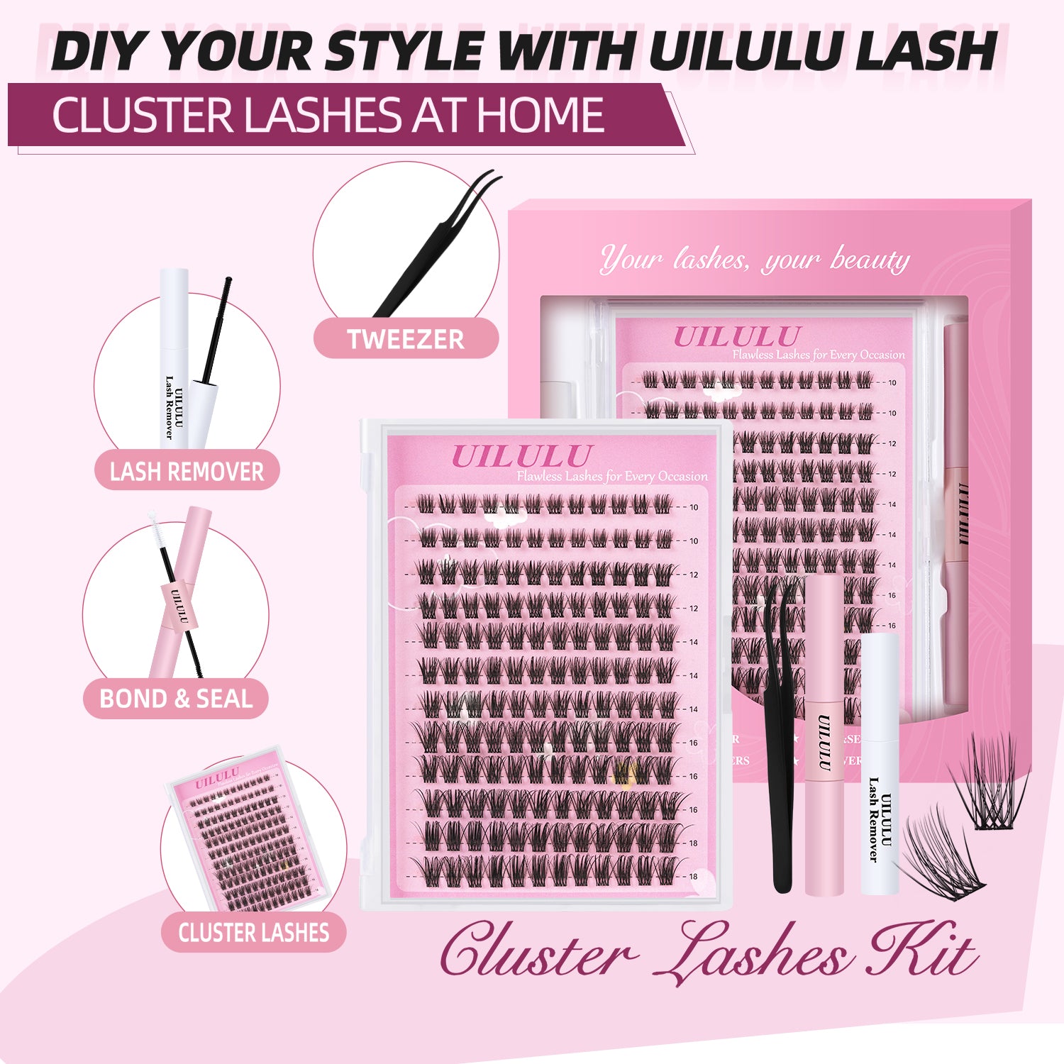 - UILULU Lash Clusters Kit: The package comes with one box of 144-count false eyelash clusters(D Curl, the lengths are 10-18mm mixed), lash bond & seal X 1, lash glue remover X 1, lash tweezers X 1. Our lash clusters are made with the finest updated PBT materials to ensure softness, thickness, durability, and longevity, designed to give you fuller lashes that look more natural than traditional false eyelashes